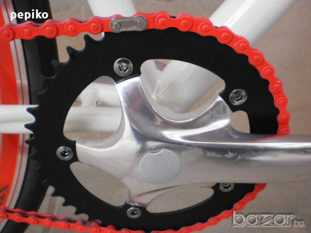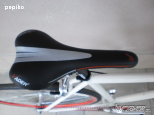 НОВ шосеен велосипед сингъл спиид HERO,сглобен във България модел 2014г олекотена метална рамка 28 цола с една скорост, с два венеца отзад, единия свободен , другия твърд, напред и назад, алуминиеви курбели SHIMANO, средно движение SHIMANO касета, удобна спортна силиконова седалка VADER, цветна верига, алуминиеви двойностенни усилени капли цветни червени, предна и задна алуминиеви спирачки PROMAX,алуминиеви педали, гуми Кенда 700 X 23 C, предна и задна алуминиеви главини JOYTECH,много бърз и стегнат ход много добре се придвижва, много красив велосипед.размер на рамката 57 см тегло 11,900 кг.