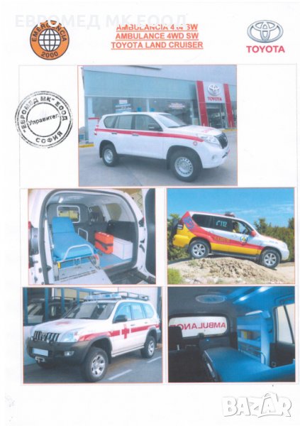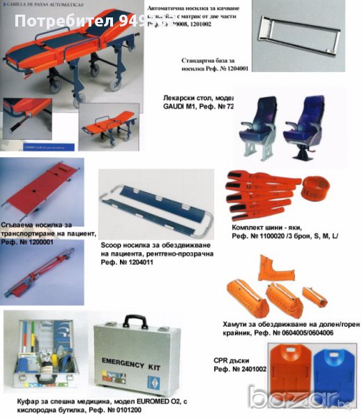 оборудване за спешна помощ - носилки ; спинални шини ; шийни яки ; вакуум матраци , аспиратори , транспортни респиратори ; дефибрилатори, AMBU ; сет при катастрофи ; кислороден концентратор ; надуваеми шини ; куфар за спешна помощ ;