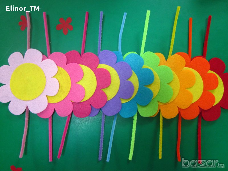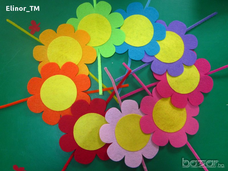 Изработени от филц и плюшени пръчки.По желание може и със секретна игла за закачване на дрехата.Размер на цветето:14 см.
