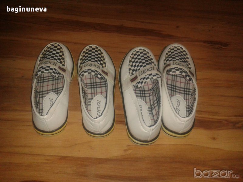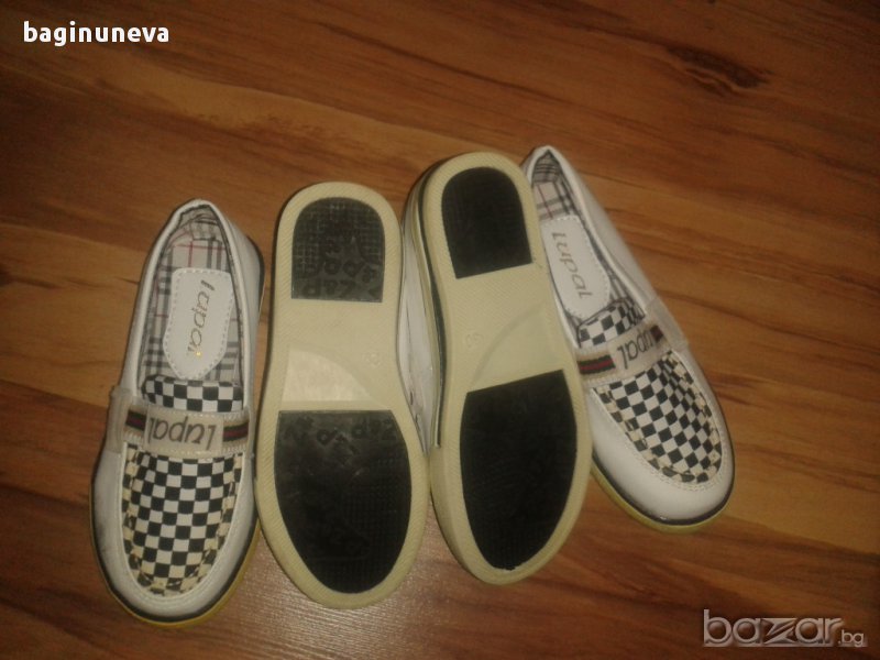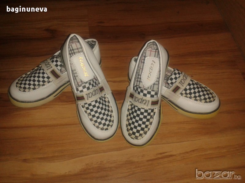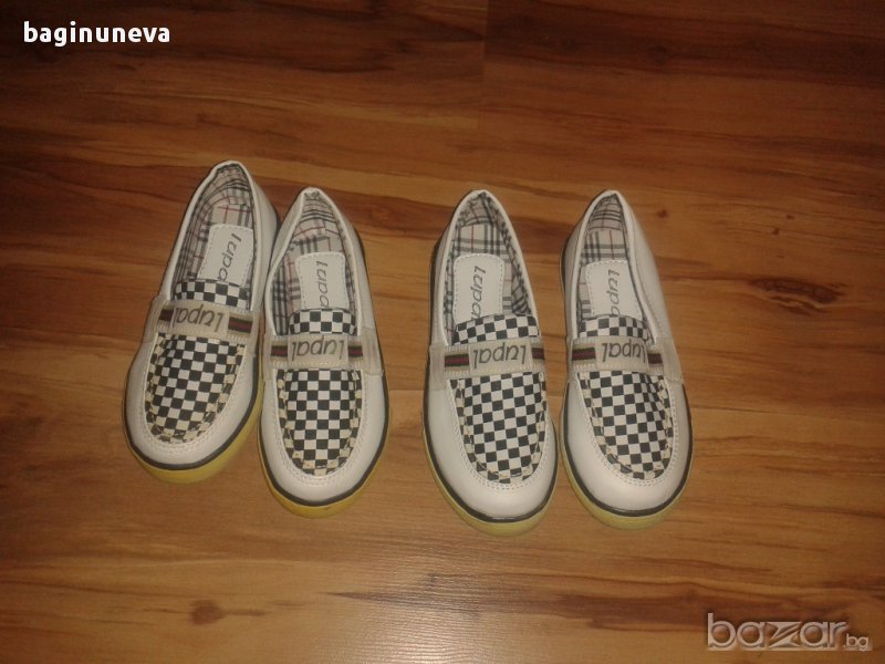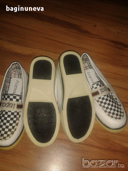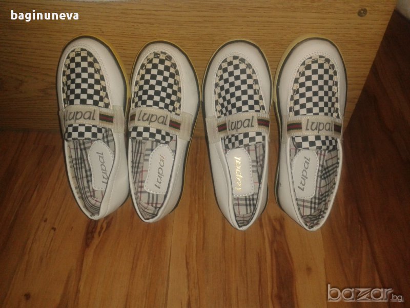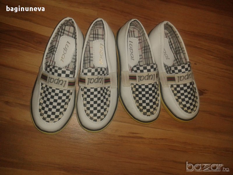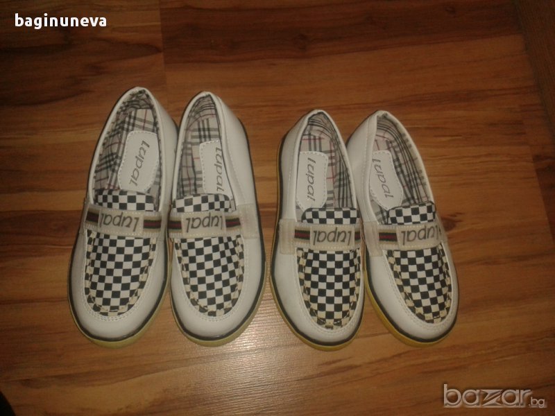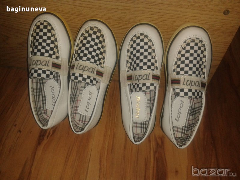 Нови детски бели кожени мокасини с велурено черно каре от горе