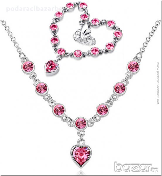 Луксозен, изключително женствен дамски комплект бижута от гривна и колие инкрустирани с кристали Сваровски.Прекрасно съчетание на нежност, блясък и класическа красота.Всяка стилна дама ще оцени подобни бижута, неподвластни на модата и времето.Подходящи са за всеки повод – вечерен прием, празник, делови обяд, като нотка стил и лукс в ежедневният тоалет.Комплекта се предлага в три варианта – златно с розови кристали, сребърно с розови кристали и сребърно със сини кристали.Моля, виж снимките и при заявка посочи, кой цвят желаеш да получиш.