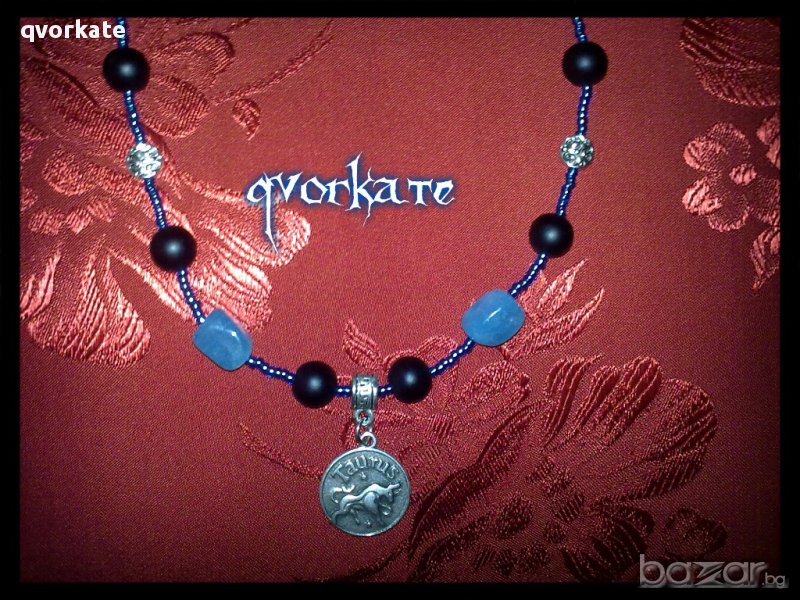 Колие със зодия Телец-от ангелит,оникс,метални елементи,чешки мъниста-в разгънато състояние 51см.