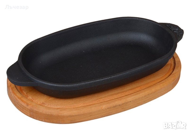 - Чугунен овален порционен тиган с две лети дръжки с дървена подложка или без подложка, неемайлиран (снимки 8-9):