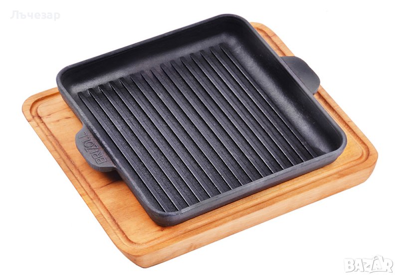 - Чугунен квадратен порционен грил-тиган с две лети дръжки с дървена подложка или без подложка, неемайлиран, 180*180 мм, височина 25 мм (снимки 6-7):