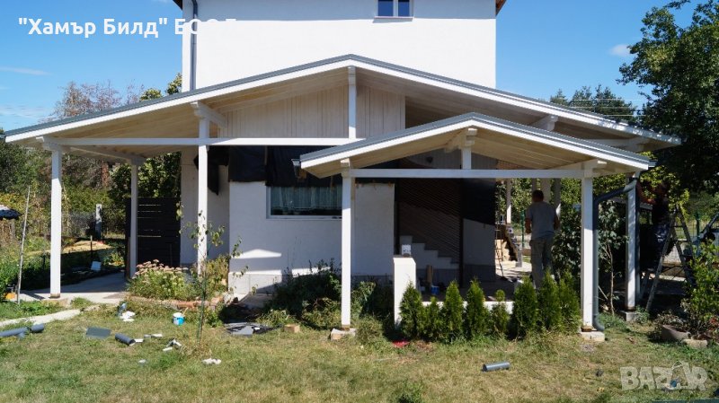 Хамър Билд ЕООД град София, се занимава с проектиране и изграждане на различни покривни конструкции от дърво като: дървени навеси за коли, дворни беседки, летни барове и открити заведения, навеси за летни кухни, декоративни перголи, навеси за балкони и тераси. Отлично качество на добри цени !