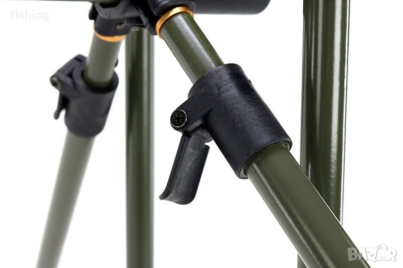 Телескопичните крака (отпред) позволяват стабилно закрепяне на всякакъв терен. Елементарната на пръв поглед система, осигурява бърз и лесен монтаж и демонтаж, както и надеждно застопоряване на всички елементи в желаната позиция. Отличава се със здрави и солидни бъз-барове, които притежават стандартни накрайници, изработени от месинг, върху които можете да монтирате електронни сигнализатори (зумери). Бъз-баровете могат да се регулират по височина, така че да постигнете максимално удобната за Вашите пръчки позиция. Стойката е снабдена и с удобен
