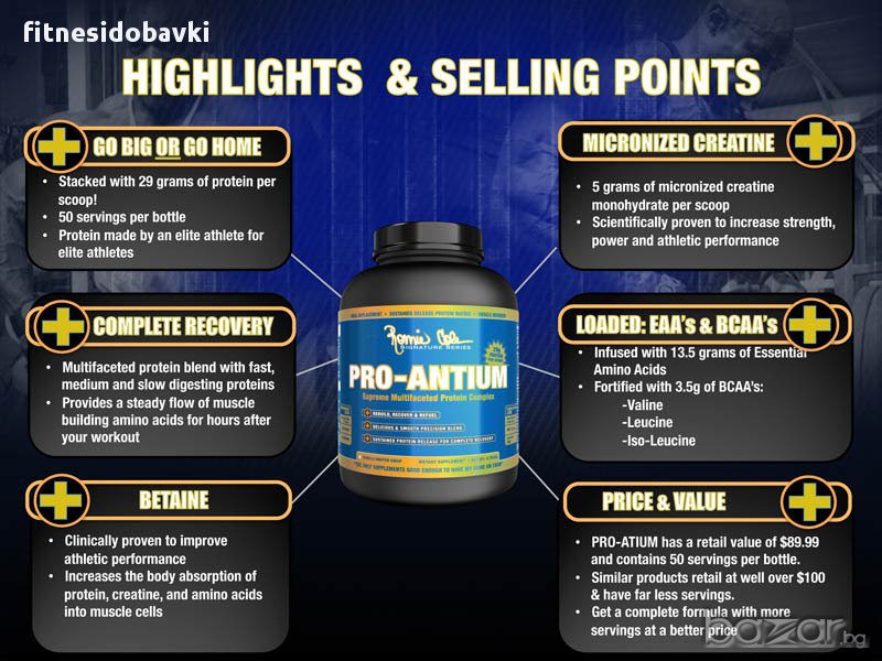 протеин. Протеинът ви помага да възстановите увредените мускулни влакна и е от съществено значение за здравето на костите и ставите. Поради тези причини хората, които искат да изградят мускули, знаят, че това е съставката, от която се нуждаят. Протеините от различни източници са от съществено значение за увеличаване на абсорбцията и повишаване на резултатите. Ronnie Coleman Pro-Antium е точно такава протеинова добавка, съдържаща матрица от най-анаболните протеинови източници.