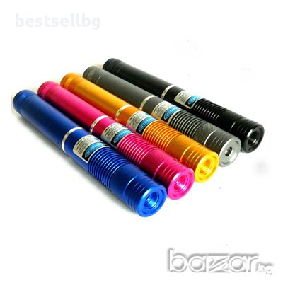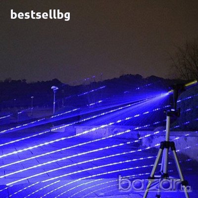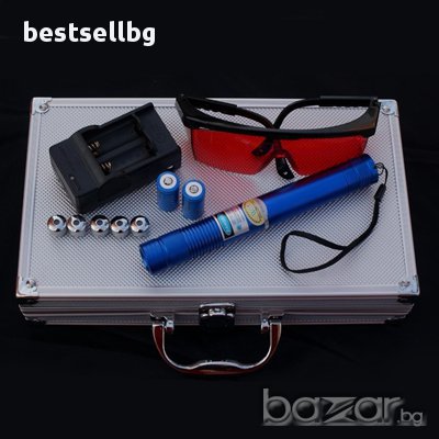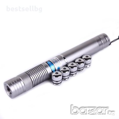 Мощен виолетово-син акумулаторен лазер 1000mW с 5 приставки и предпазни очила, пука балон, запалва клечка кибрит или цигара
