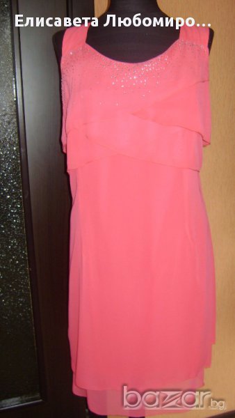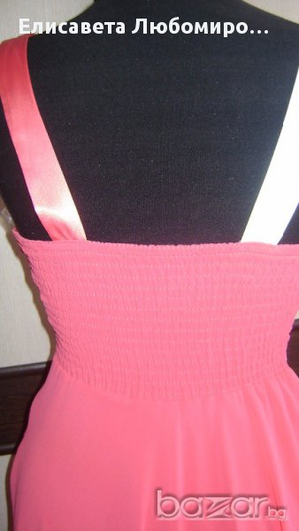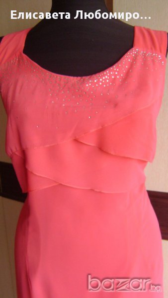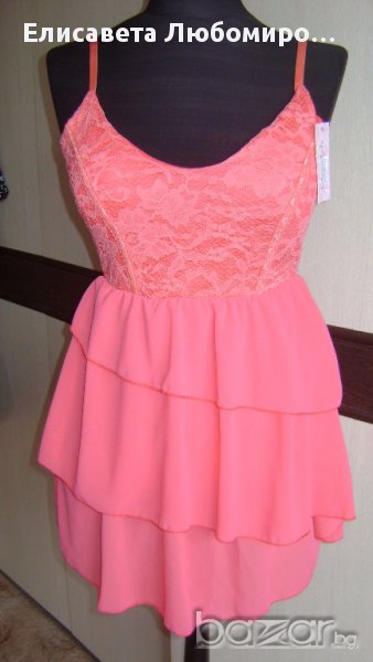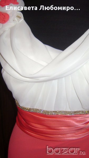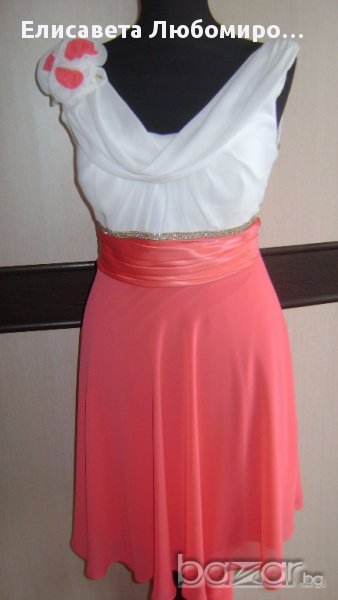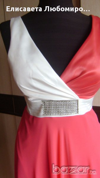 светло син шифон с набор в горната част и много ефектна дантела разм.-38,корал с бяло прехлупено Vобразно деколте горна част памучен сатен долна шифон разм.-40 ,корал и бяло гръцко деколте ,ефектен набор,подвижни рози изработена от шифон разм.-42, коралова от шифон с ефектни асиметрични волани в горната част разм.-42 цена ,коралова горна част от ластична дантела долна волани от шифон разм.S-M,цена от -155лв.