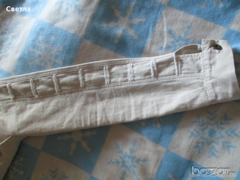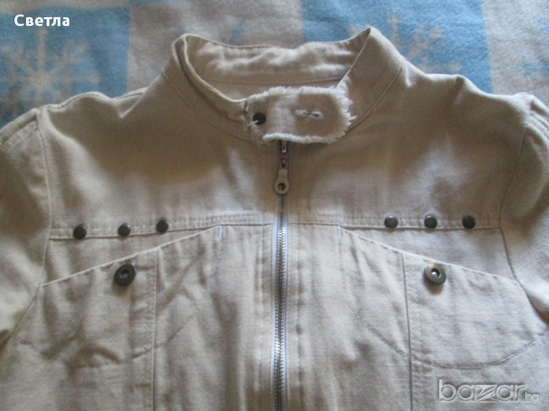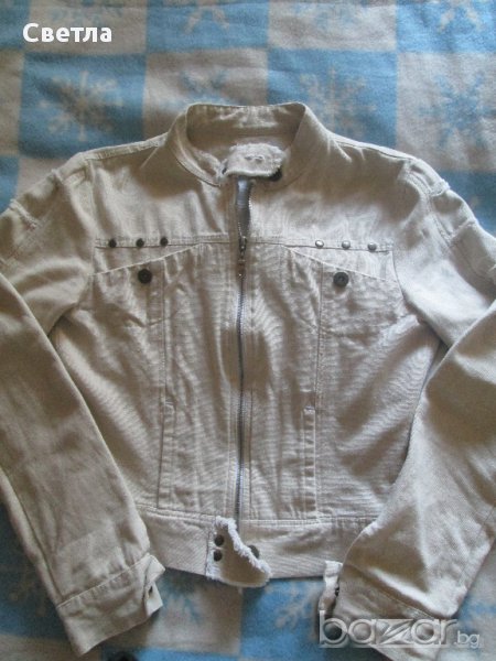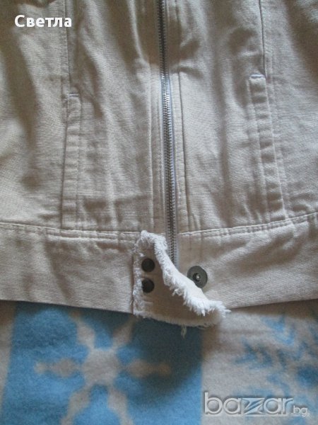 Светло бежово якенце вталено-памучен дънков плат, но мекичко-за пролетта и лятото. Състояние-като ново.