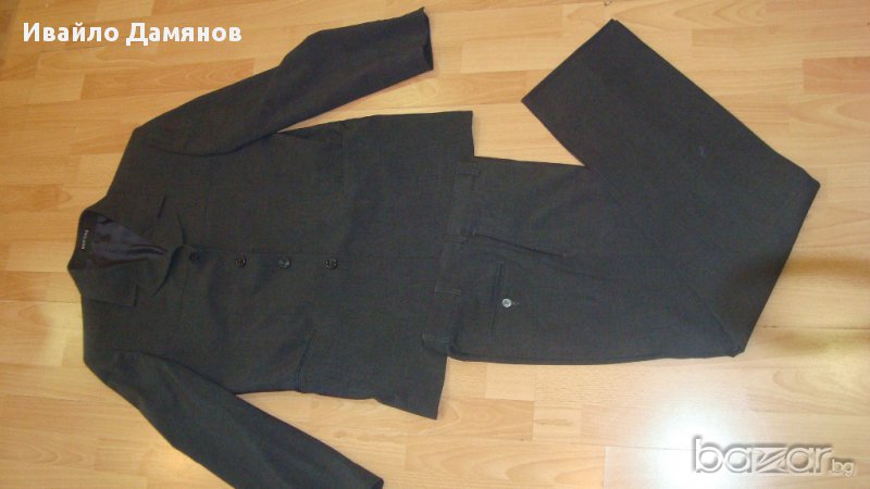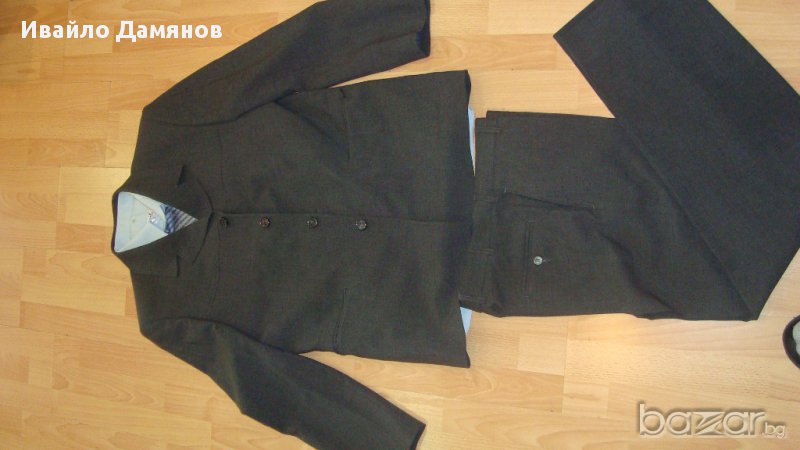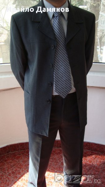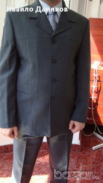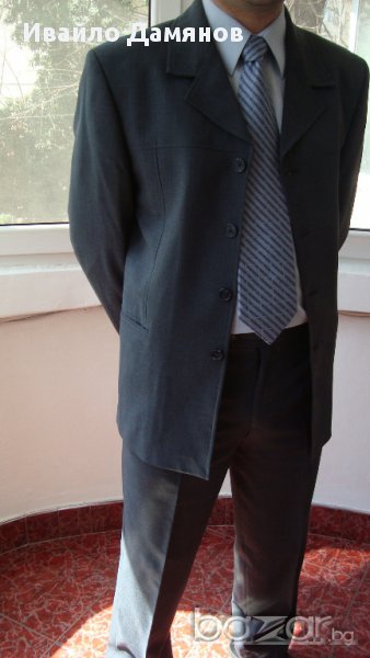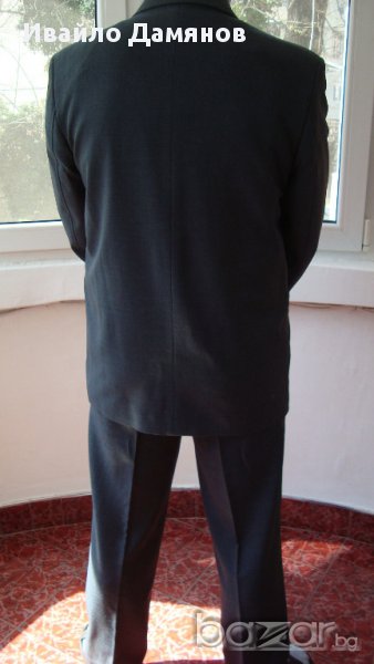 вътрешни и два външни джоба. Размери Ш – 54см, Д – 72см, дължина на ръкава – 65см. Панталона е с два джоба отпред и един отзад, Ш – 43см Д – 106см. Костюма е като нов. Обличан е два три пъти.