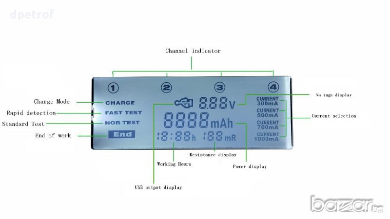 Това за мен е най доброто универсално зарядно в момента на пазара, визирайки параметъра цена/ качество : поддържа 4 напълно независими зарядни канала с избираем заряден ток от 300 до 1000ма, измерва автоматично вътрешното съпротивление на клетката, функция анализ и възстановяване, функция възстановяване от 0 волта, функция цикъл на заряд, 6 вида защити ( всъщност всички възможни)