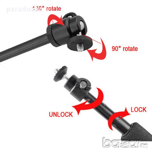 Заключващи се звена!!! Подходящ за екстремни спортове и средноголямо натоварване. Дължина в разгънато положение около 55см. , в събрано около 20см. Максимално тегло което може да носи около 500гр. Не е подходящ за ползване с тежки фотоапарати, видеокамери над 0.5кг. Изработен е от здрава алуминиева сплав и пластмаса. Регулируема чупеща, въртяща се на 180 градуса глава. Дръжката е с покритие от мека пяна предотврътяваща хлъзгане на ръката. Връзка за ръка за по-сигурно носене.