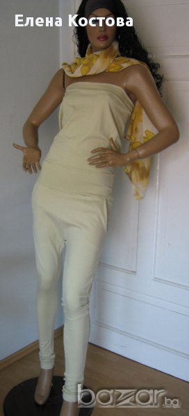 Гащеризон с отворен гръб в кремав цвят. Долната част е със смъкнато дъно на панталона,горната- бюстие с гол гръб.