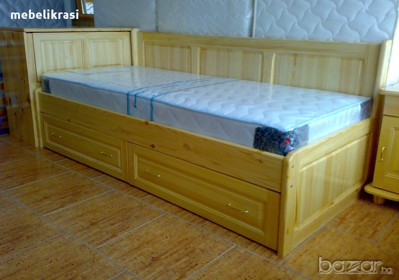 Чекмеджетата са с ролков механизъм. Леглото на снимката е за матрак 82/ 190 см, като може да се изработи и в желания от клиента размер.