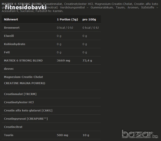 Комбинация от най-съвременните форми на креатин, характеризиращи се с най - висока анаболна активност. Благодарение на това, освобождаването на креатинови молекули е най - силно веднага след консумацията на продукта. Това е от
