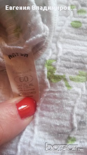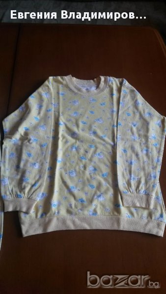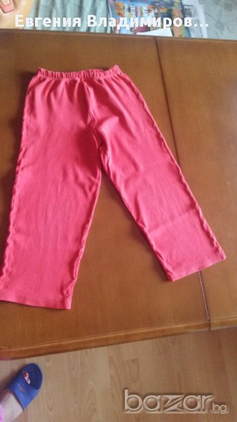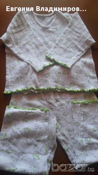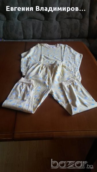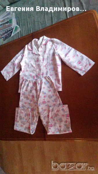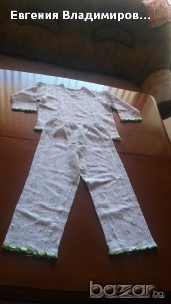 Сн. 1-5 - пижамката е българско производство, размер 36, тъничка - за пролетно-есенно време или за по-хладно лято. Запазена е добре. Сн. 6-9 - материята е крепон. Размерът по етикет е 60. Подходяща за възраст 4-7 год.