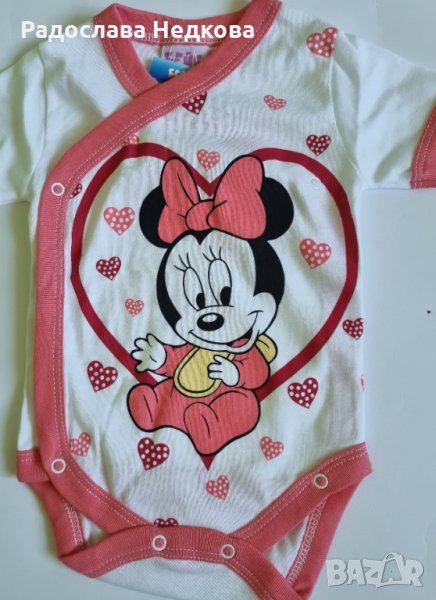 Страхотно бебешко боди с къс ръкав и странично закопчаване. Отпред е с апликация на Малката Мини. Налични размери - 62 см. Българско производство! Цена 6.90 лева за 1 брой!