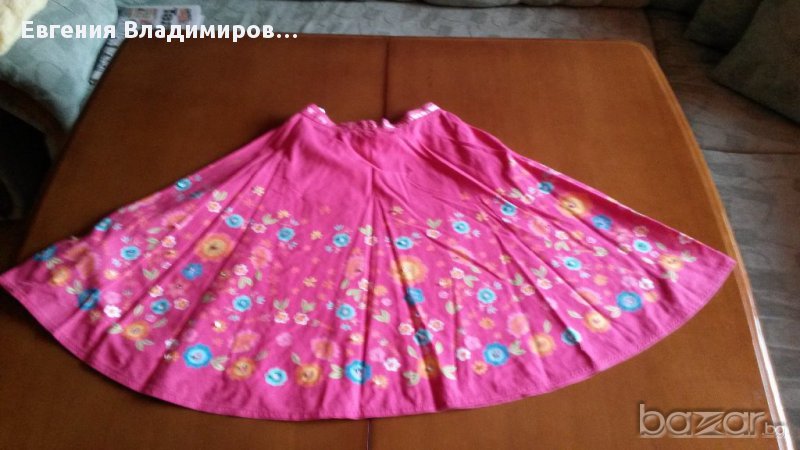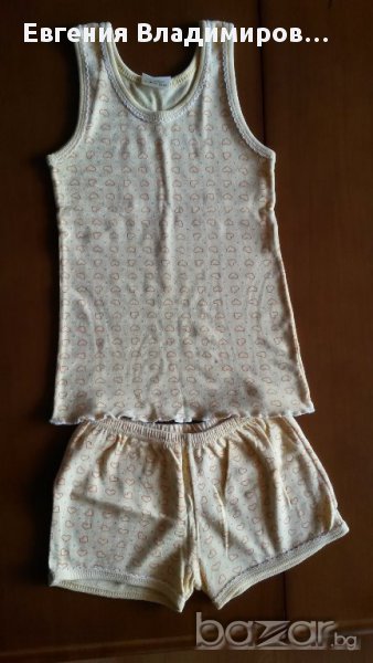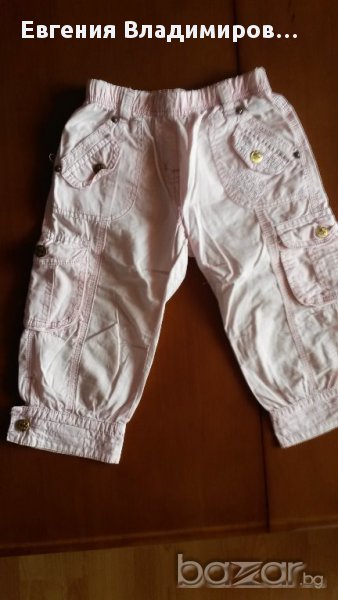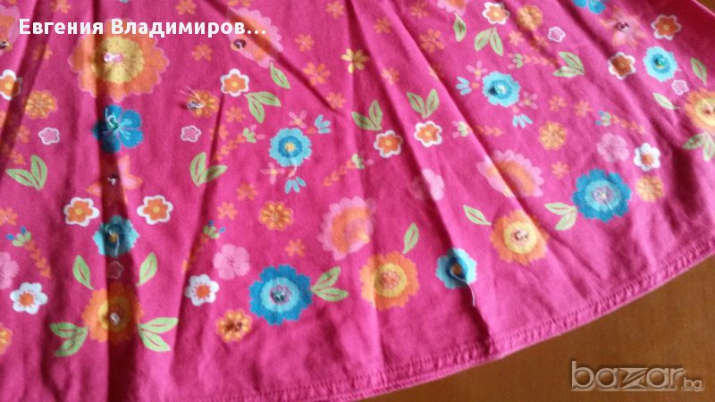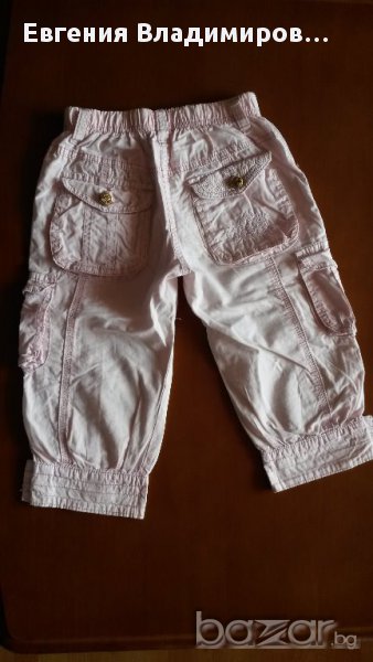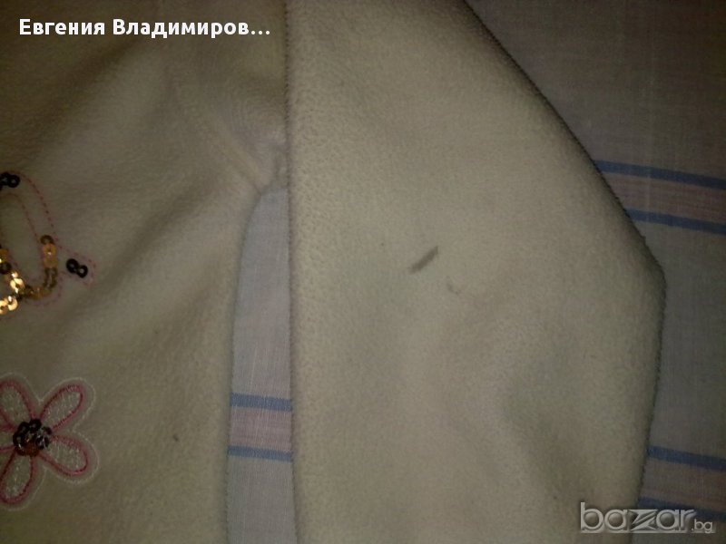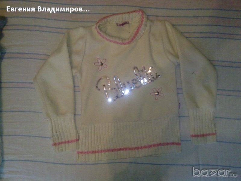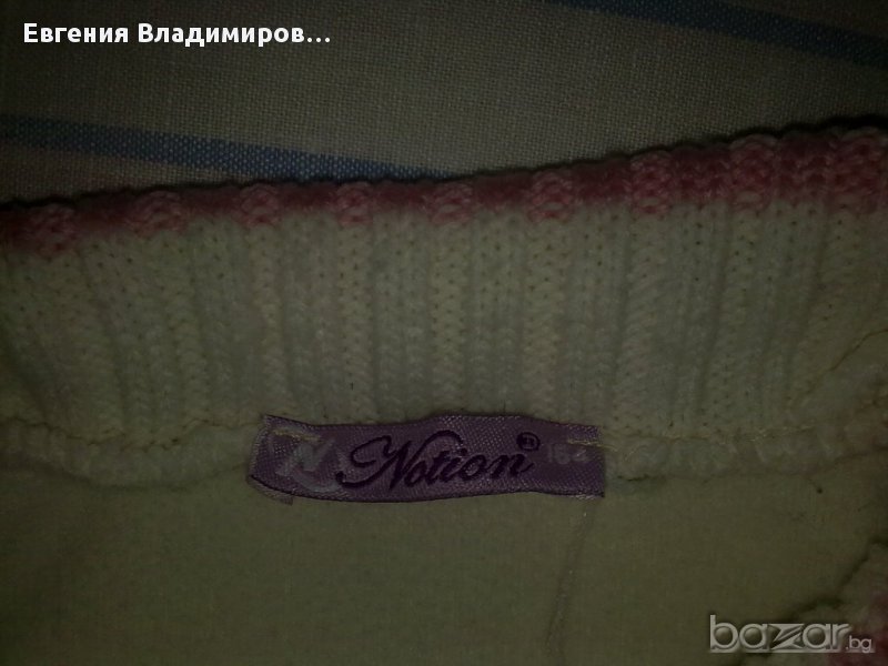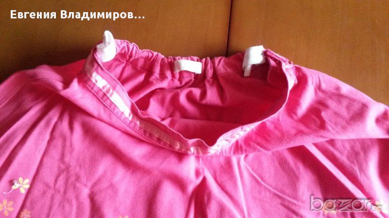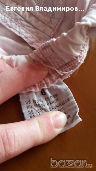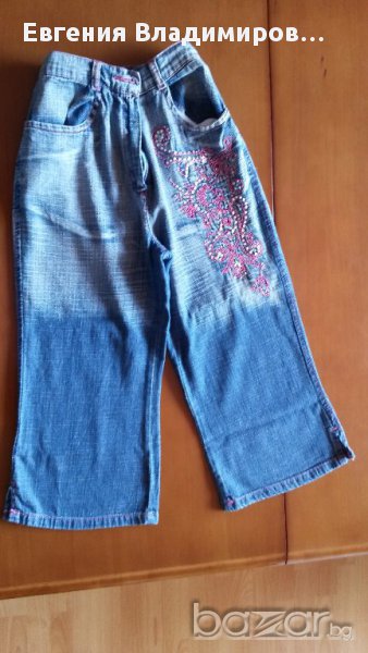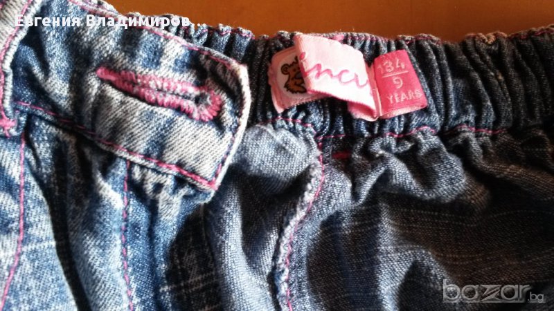 На ръкава има петънце - снимала съм. Размер по етикет 164, но зависи от детето, ако е по-слабичко става за 7-9 год. Дънките са обличани броени пъти. Розовият панталон също е добре запазен, както и комплектчето с късите панталонки. На полата са и паднали няколко пайети, но не е толкова забележимо.
