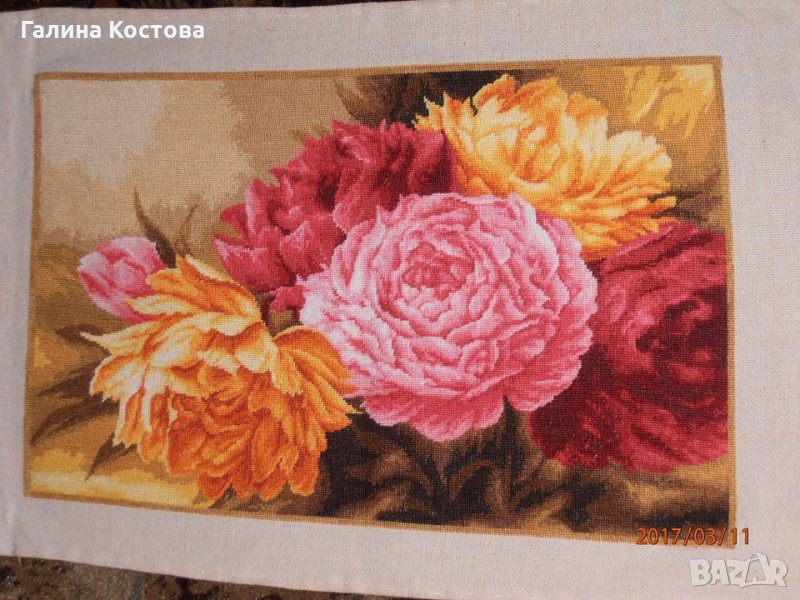 Гоблен Божури - 35/22 см., 16/11 квадратчета, цена на квадратче-2 лв., цена на гоблена -300 лв., конци ДМЦ