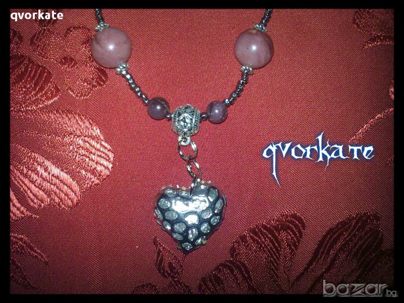 Колие Сърце-от мукаит,родонит,метални и пластмасови елементи,чешки мъниста-24,5см.