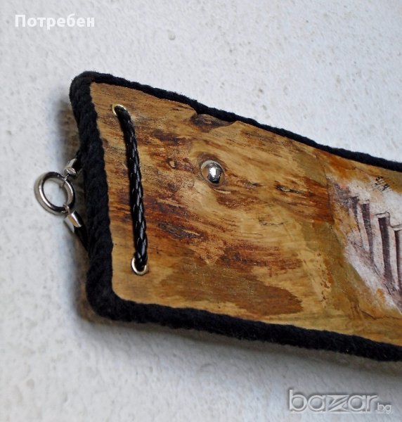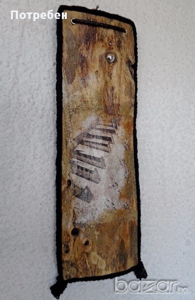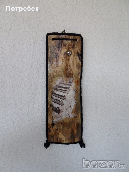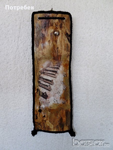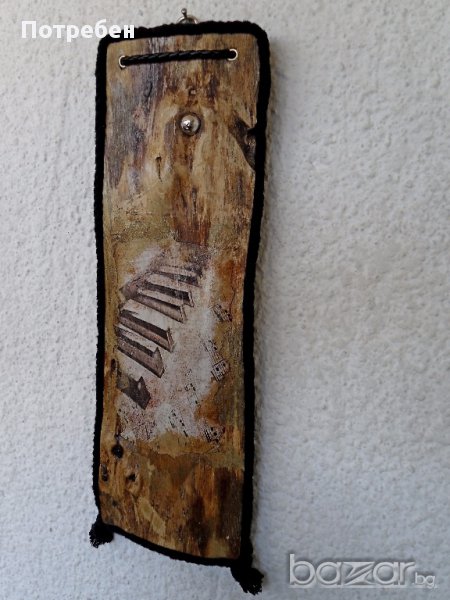 Приблизителни размери: 37см / 14см / 1.5см За всички, които обичат музиката, естествените материали и нестандартните форми - чудесна идея за подарък, свежа вещ за стената на вашия дом, офис, заведение. Материали: Чамово дърво, метал, кожа, декупажни елементи. Продукт - уникат. Още от продуктите ми, можете да видите в сайта ми: