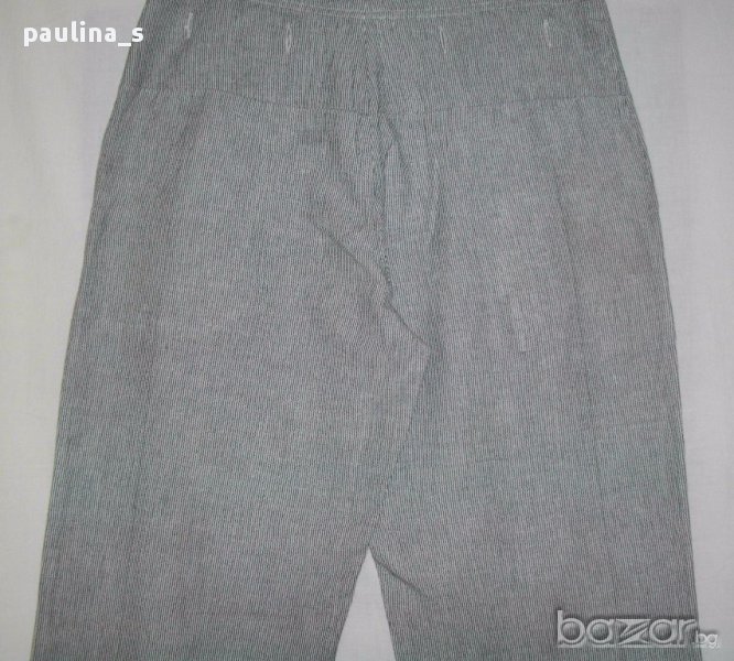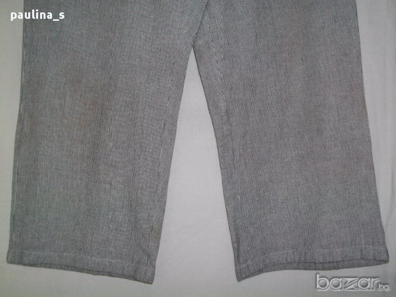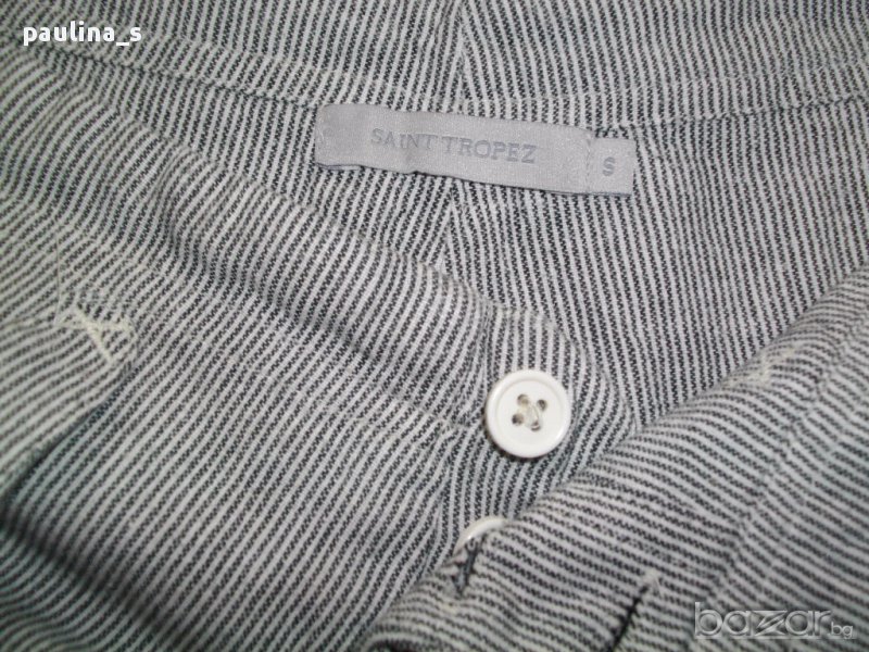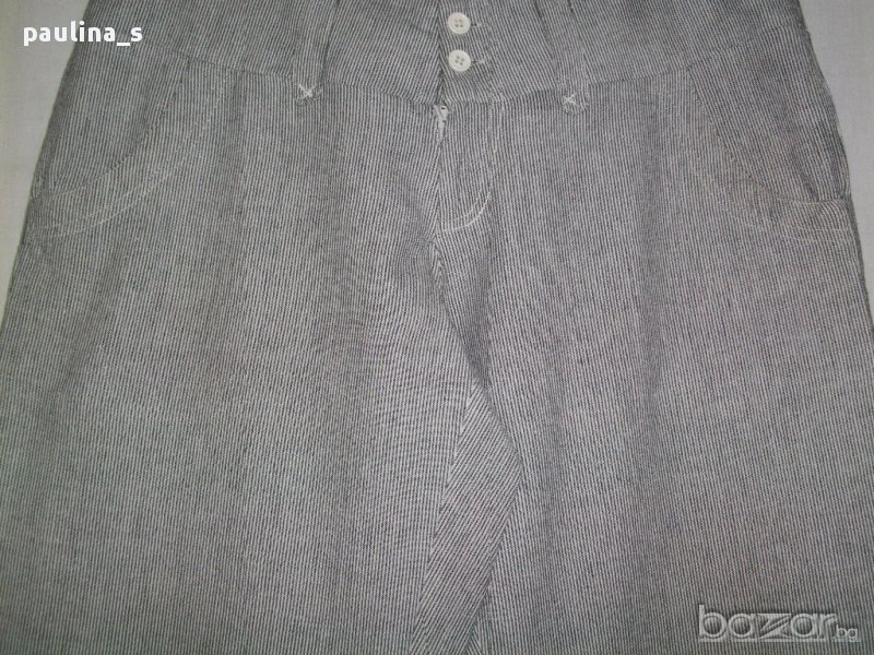 1️⃣ . M / XL - "Saint Tropez". Цената е крайна 29,99лв. Дамски бермуди от мек индииски памук. Десенът е на дискретни черно-бели райета. Моделът е с висока талия, като гайките са широки и ниско поставени-може да се носи с колан за ханш или да се прониже шнур в подходящ цвят в малките отвори на нивото на гайките. Закопчаването е 4 бели копчета и къс цип до нивото на ханша, откъдето започват и джобовете. По желание по-изобретателните дами може да си нанижат шнур(или ластик)долу на крачолите и да модифицират бермудите в шалварки, по избор.