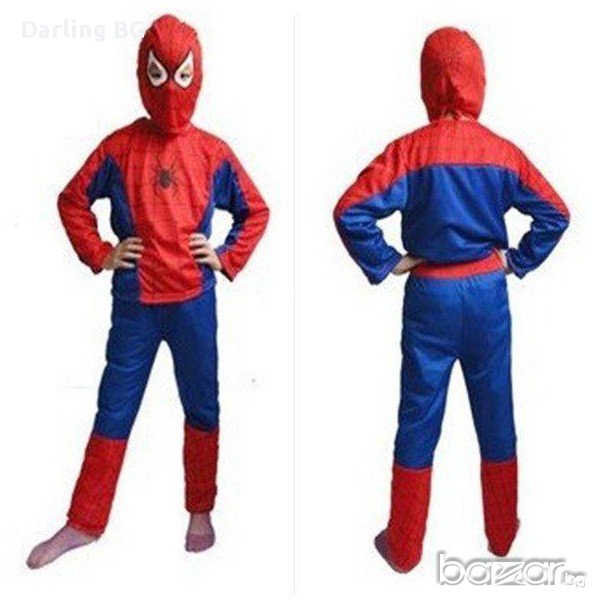 Детски костюми на Спайдърмен изработени от полиестер с логото на героя.Състой се от 3 части-панталонче, блузка и маска за цялата глава..Китайски.