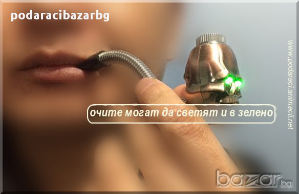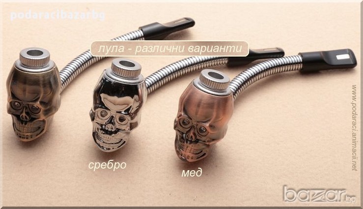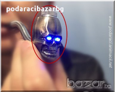 Лула с нестандартна форма на череп и за капак на всичко със светещи очи!Виждал/а ли си такова чудо?!Дори и да не си, вече можещ да го имаш и пробваш реално.Да се пуши не било добра идея, но сега няма да се нравоучаваме, я...С тази лула на парти дори и порока ти – пушенето ще изглежда привлекателен, направо атрактивно.Лесно ще се справиш с подробностите.Капачето в горната част се отваря и се поставя тютюн или ароматни билки, какъвто имаш под ръка.При пушене очите на черепа светят ярко в синьо или зелено, според късмета, каквито се паднат на твоята лула.За момента тя се предлага в два цвята на метала – сребро и мед.Моля, виж снимките и при заявка посочи кой вид желаеш да получиш.