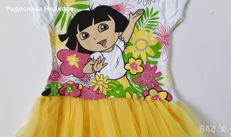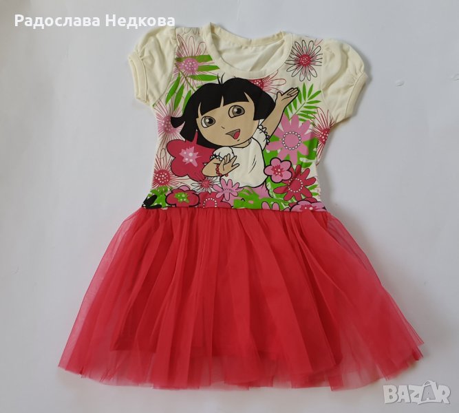 Страхотна лятна туту рокля с апликация на Дора. Горната част е памучна, а долната е от тюл с подплата. Българско производство! Налични размери и цветове: