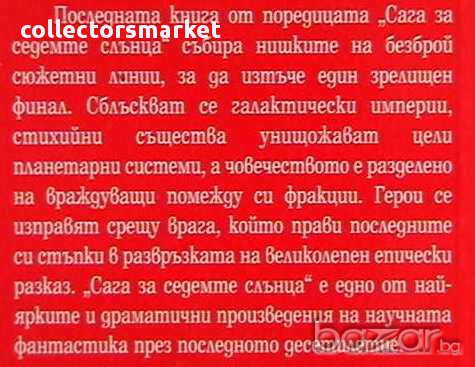 Последната книга от поредицата „Сага за седемте слънца” събира нишките на безброй сюжетни линии, за да изтъче един зрелищен финал. Сблъскват се галактически империи, стихийни същества унищожават цели планетарни системи, а човечеството е разделено на враждуващи фракции. Герои се изправят срещу врага, който прави последните си стъпки в развръзката на великолепен епически разказ. „Сага за седемте слънца” е едно от най-ярките и драматични произведения на научната фантастика през последното десетилетие.