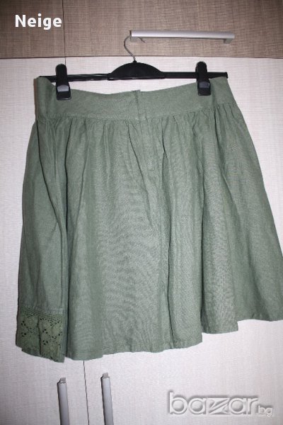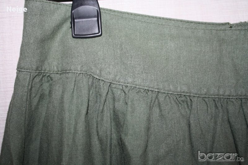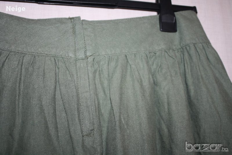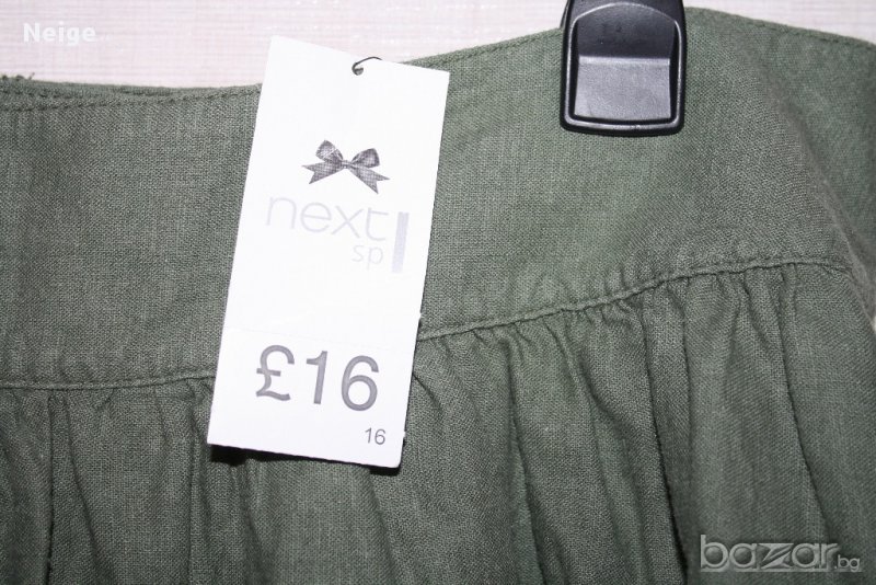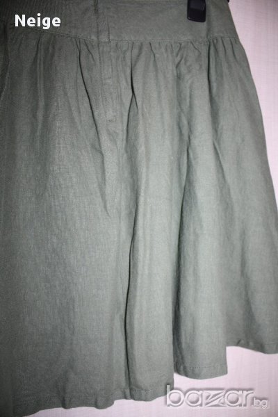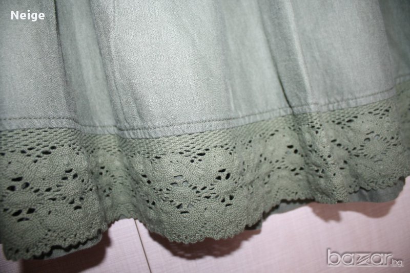 Нова, с етикет. Малко ми е голяма за жалост, затова я продавам. Цветът е зелен, ненатрапчив, много приятен. Закопчава се с цип отзад. Предната част е с дантела. 55% лен, 45% вискоза. Прекрасна за лятото. По етикет 16 Ук и 44 европейско.