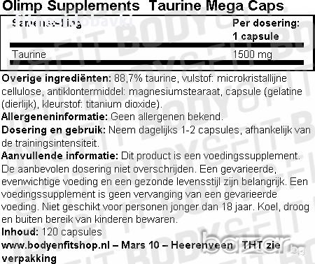Olimp Taurine Mega Caps е една от най-богатите аминокиселини в организма, които могат да бъдат намерени в централната нервна система, белите кръвни клетки, мозъка и скелетни мускули. Той може да помогне за подобряване на физическата активност и телосложението.