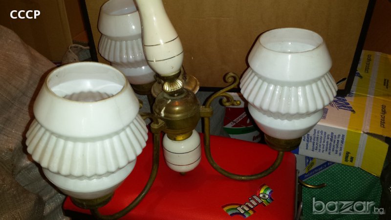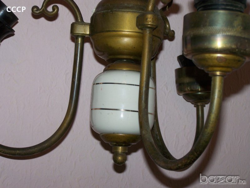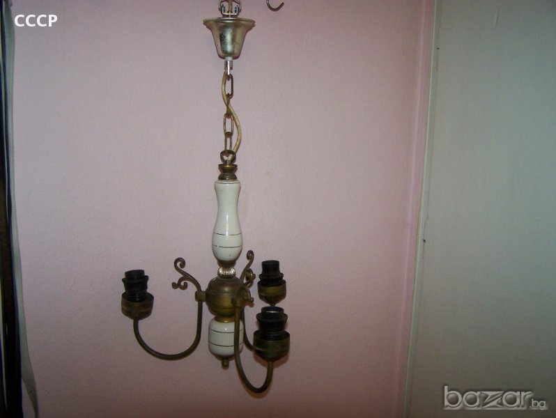 масивен полилей месинг и порцелан,плафоните или там както се казват са стъклени има и един резервен общо 4 бр, веригата също е бронз. не е от гръцките боклуци които заливат пазара -за ценители-ЦЕНАТА Е КРАЙНА И НЕ СЕ КОМЕНТИРА !!!!