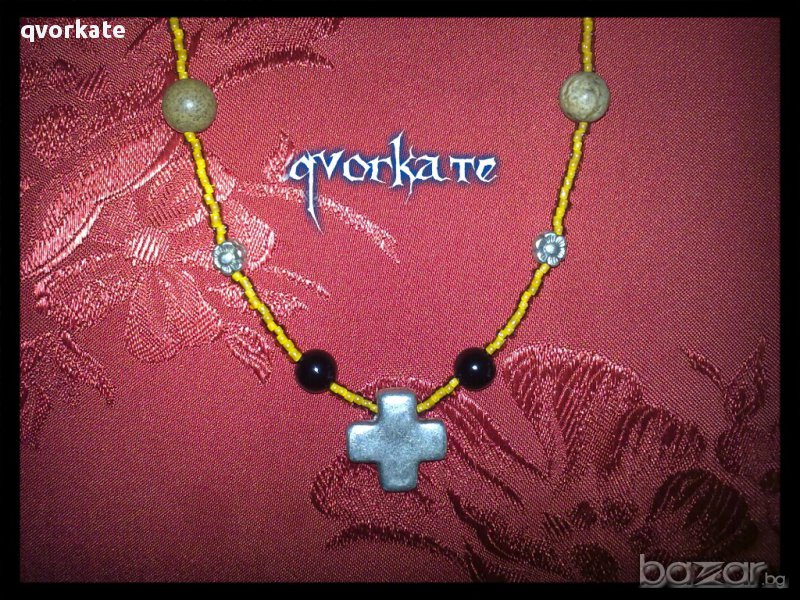 Колие с кръст-от оникс,жадеит,метални елементи,чешки мъниста-23см.