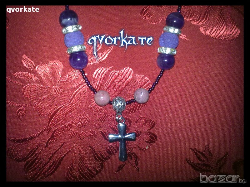 Колие с кръст-от родонит,аметист,лава,метални елементи с кристали,чешки мъниста-27см.