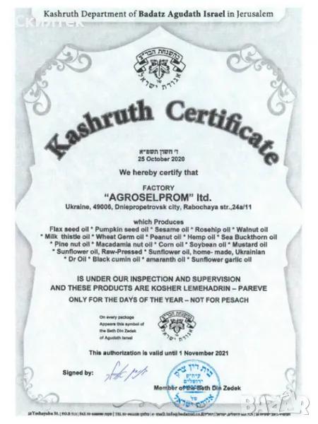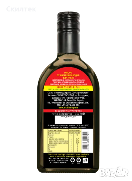 Фирма „Скилтек“ ЕООД, официален представител за България, Ви предлага растителни масла от първа преса (олиа) в стъклена бутилка 350 ml - EXTRA VIRGIN VEGETABLE OILS, unrefined and non- deodorized. Manufactured by means of mechanical operations using the method of the first cold pressing. Произведени изключително по механичен способ - ПЪРВО студено пресоване, необработени, нерафинирани, без съдържание на консерванти, оцветители и ароматизанти. За директна консумация (включително и за пиене), както и като спомагателно средство при масажи и приготвяне на козметични маски.