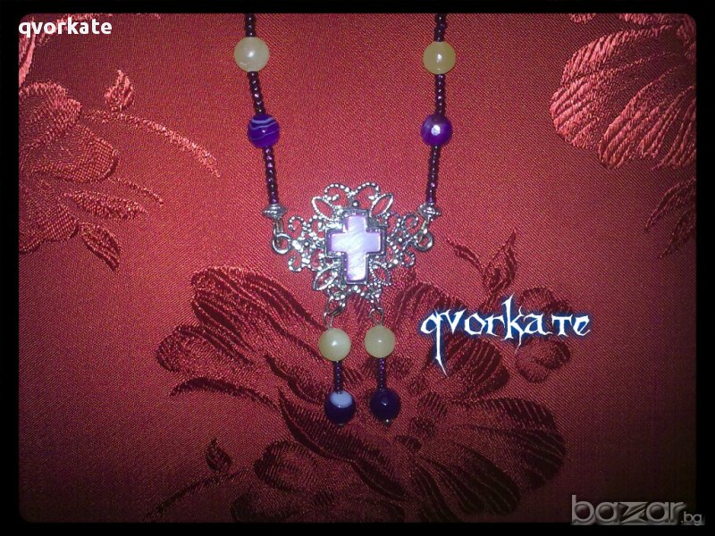 Колие с кръст-от седеф,ахат,жадеит,метални елементи,чешки мъниста-28см.
