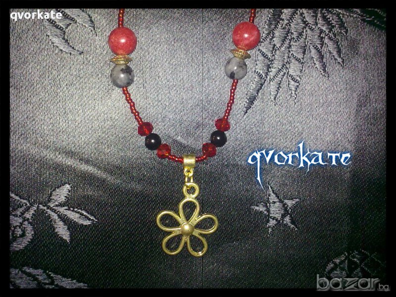 Колие цвете-от оникс,стъкло,метални и пластмасови елементи,чешки мъниста-27см.