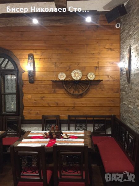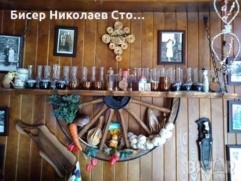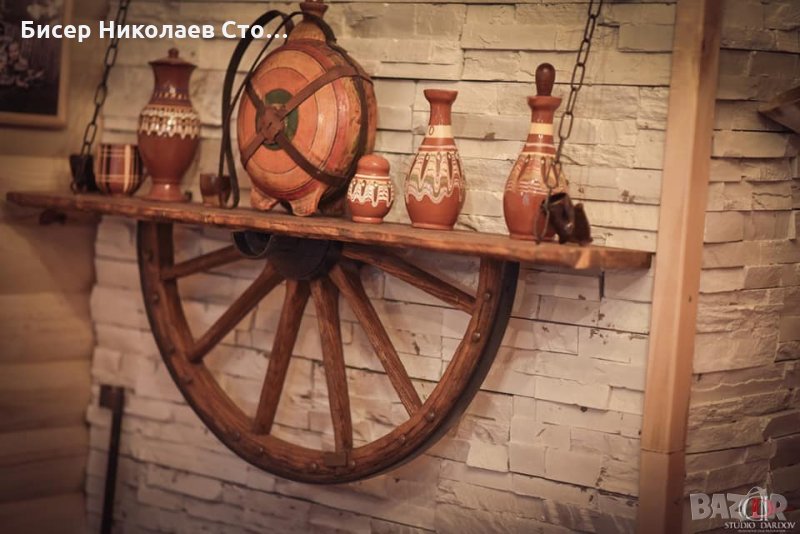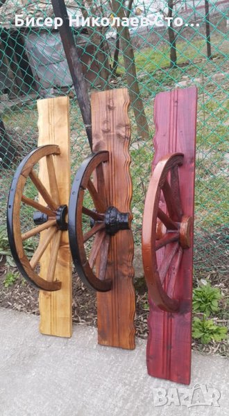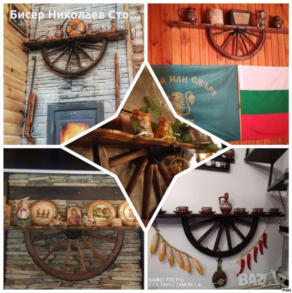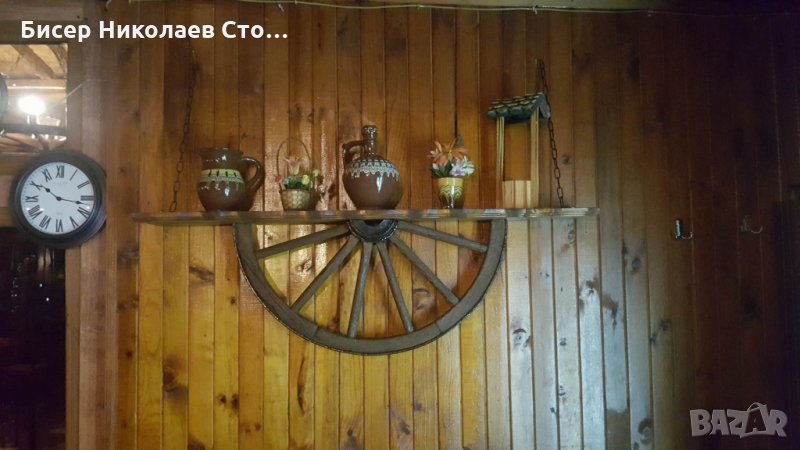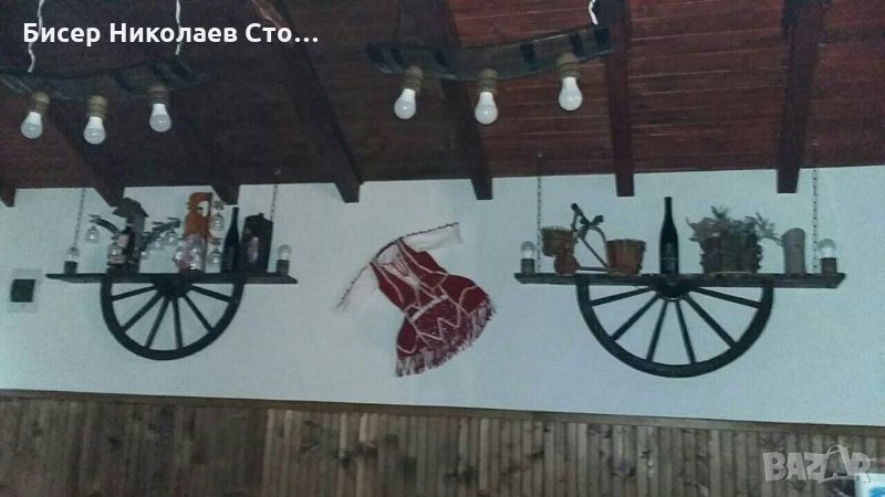 Изработвам рафт-етажерка от автентично колело от каруца размерите са 120см дължина, 75 см височина със синджирите,ширината е около 20 см!Цвета на лака може да бъде кестен,венге,орех,мхагон или дъб,металните части черни или медни.Моделът може да бъде и с лед осветление,и с 3 дървени чашки-цената е 89 евро