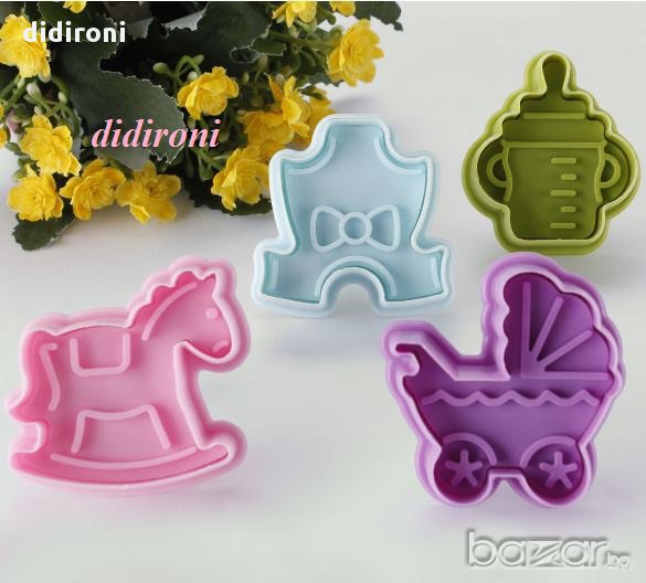 4бр. различни форми с бутало и релеф – количка, конче, беберон, лигавник. Всяка формичка е с буталце за по-лесно освобождаване на тестото. Използват се за работа с фондан, захарно тесто, марципан и други видове теста.