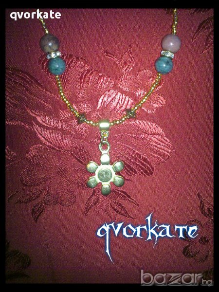 Колие цвете-от родонит,хризокола,медни ,метални елементи с кристали,чешки мъниста-29см.