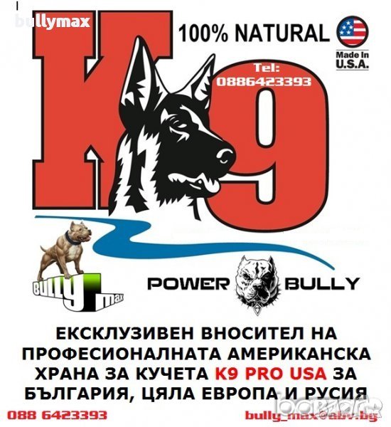 Ексклузивен вносител на професионалната американска храна за кучета K9 PRO USA за България и цяла Европа.