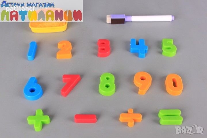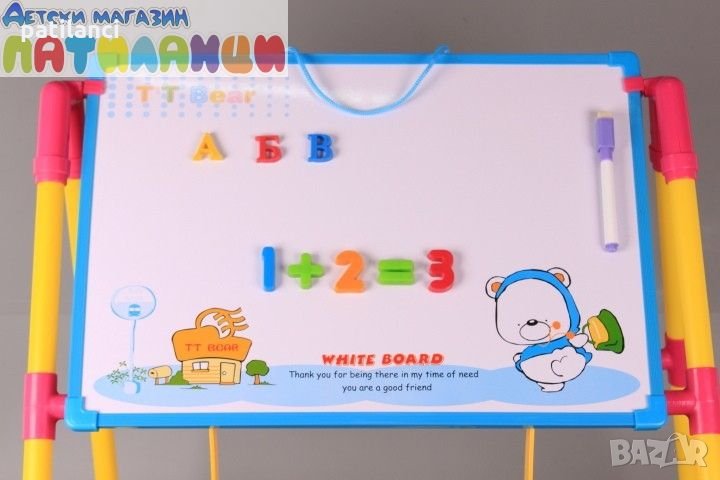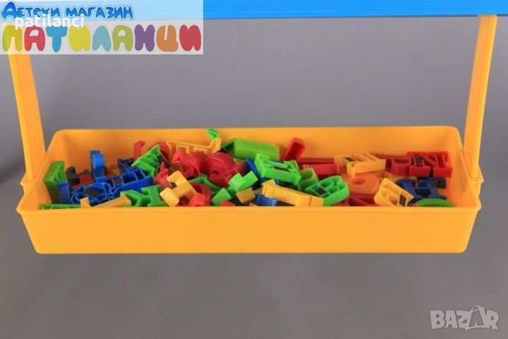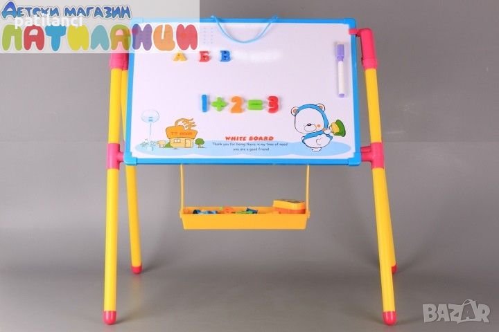 Пластмасова играчка.Комплектът съдържа магнитна дъска за писане, рисуване и подреждане на магнитни елементи, стойка за дъската, магнитни букви от българската азбука, магнитни цифри и математически символи, флумастер с изтриваща част, гъбка за изтриване, поставка за съхранение на елементите.Дъската е с две лица.Едната страна е магнитна, предназначена за нареждане на магнитните букви и елементи и също за писане и рисуване с флумастер.Другата страна е предназначена за писане и рисуване.Може да освободите дъската от стойката и да я окачите на стена.Размери на композицията със стойката-50*46*54 см.Размери на дъската без стойката-43*1*30 см.Височина на долния ръб на дъската, измерена от подовата повърхност-26 см.За деца над 5 години.