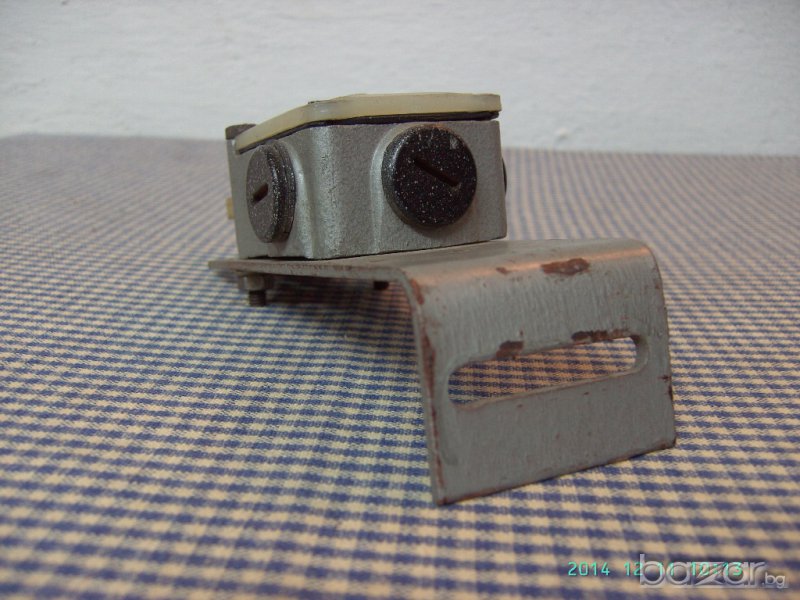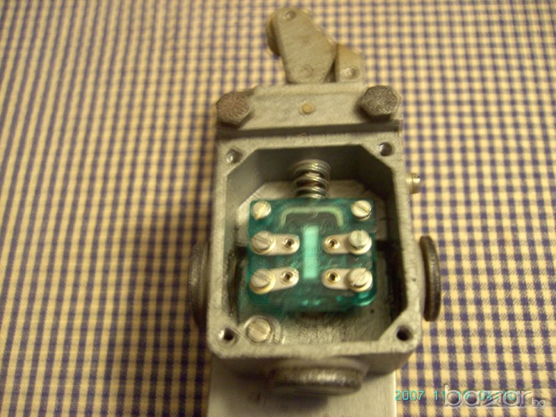 Краен прекъсвач за асансьори и др.Краен прекъсвач с лост, ролка и ъглова планка за регулиране. Производство на елпром „ИСКРА“. На металната кутия на капака пише ес871 / 380V 25A. Вътре в нея на превключвателя пише 380V 10A. Има един нормално отворен и един нормално затворен контакт.