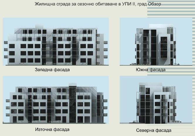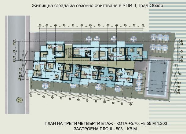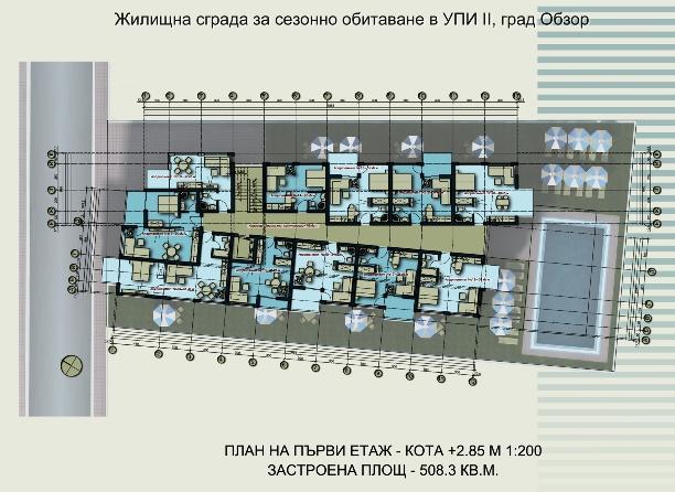 Урегулираният парцел е с площ 1100 кв.м. Проектът е на идейна фаза, предвижда пет етажен комплекс 'Sun Obzor' с РЗП - 2 394 кв.м., която включва: 44 апартаментa/ 32 студия, 9 апартамента с една спалня, 3 апартамента с две спални/, кафе-бар, паркинг и басейн.