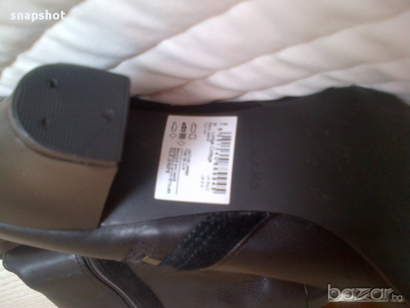 Стилни и удобни нови ботуши на Кларкс от естествена кожа и велур в черно. Височина на тока 7 см, дължина на омекотената стелка около 26.5 см, височина на ботуша без тока 25 см, ширина отгоре 17.5 см. Маркирани са като номер 6.5, който отговаря на 40.