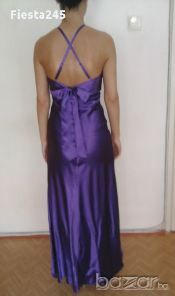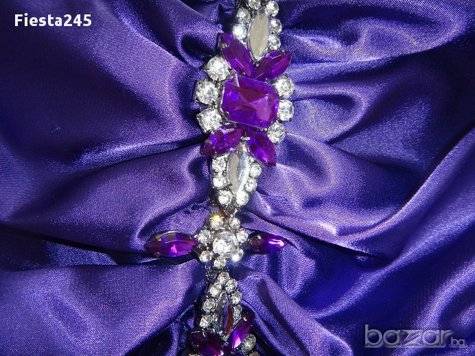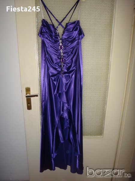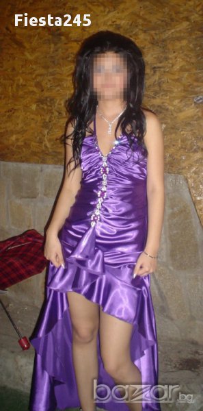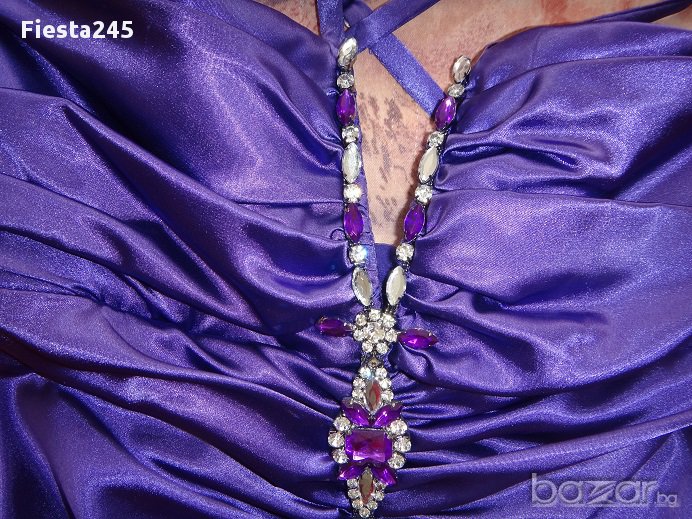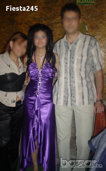 Официална рокля в перфектно състояние, като нова, абсолютно запазена. Размер s, лилава, със сребристо-бели и лилави камъни, сатенена, дължина на роклята-142см, ширина в талията-35см, към роклята има и лилав шал, дължината е 157см на 45см.