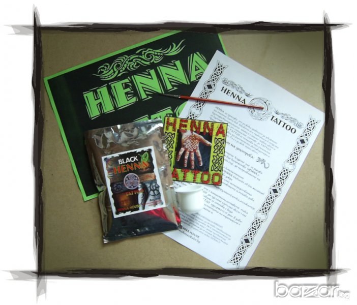 Черна хена за временни ТАТТОО. Вьзможно най-доброто качество директен внос от Индия. Смесва се само с обикновена вода и се нанася лесно , с трайност вьрху кожата 2 седмици. С това количество може да направите над 60 ТАТТОО.