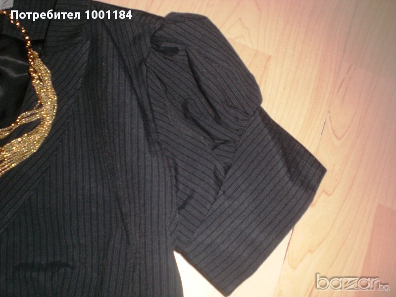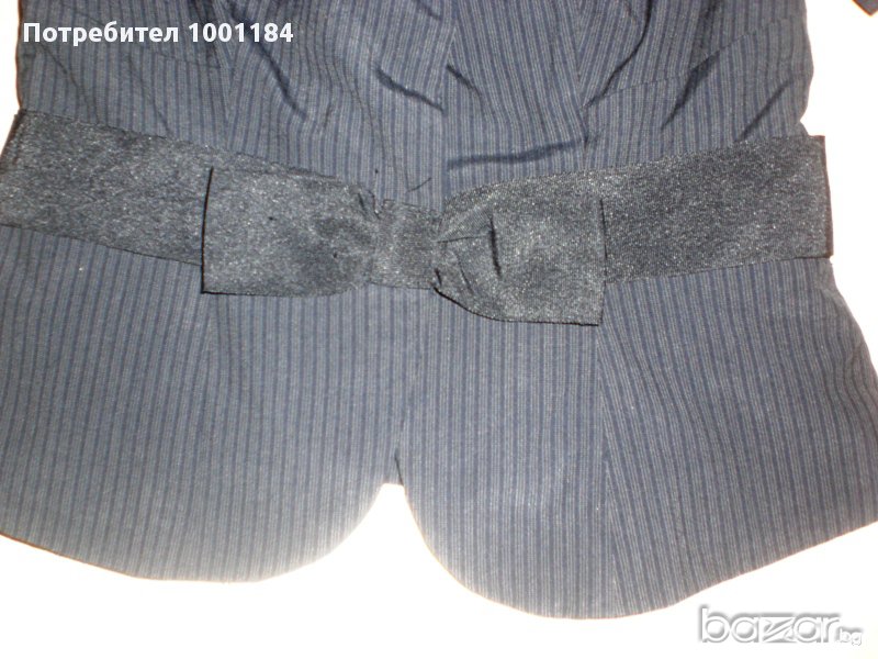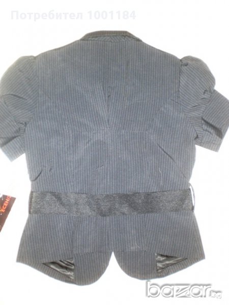 Много интересно сако-моделът е с имитация на коланче и отпред има голяма пандела,Вталено е,а ръкавът е обемен.Има подплата.Десенът е на дискретно райе.Размер М.Няма никакви забележки.